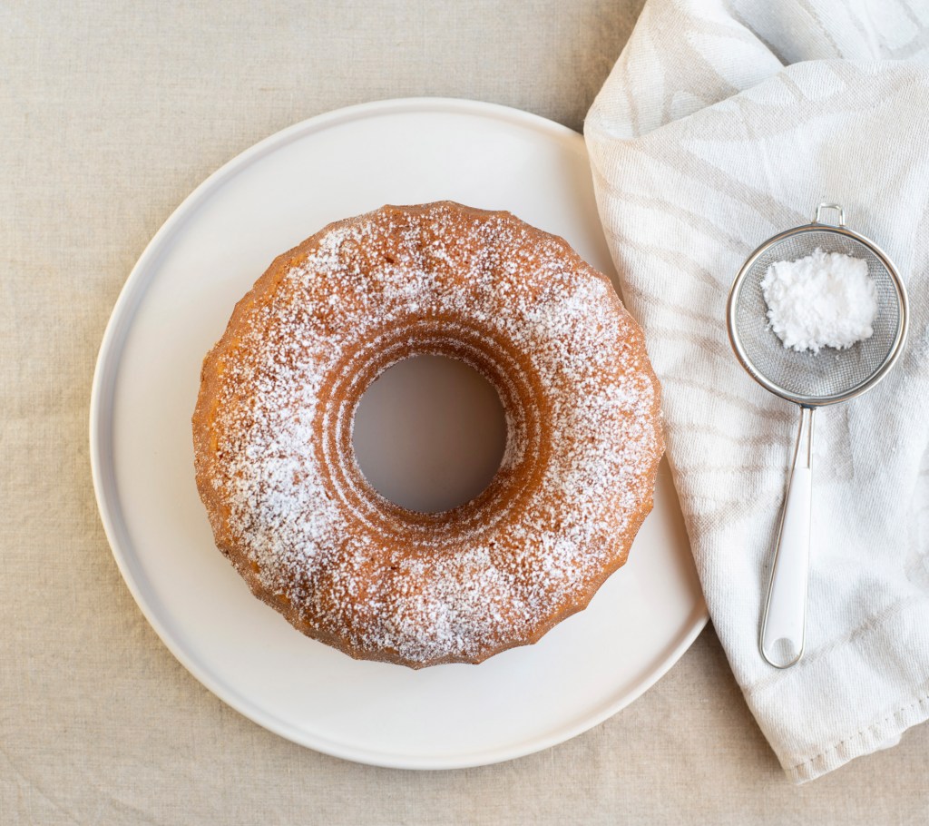 Anna kakun jäähtyä ennen kumoamista lautaselle. Voit ripotella päälle tomusokeria sihdin läpi kuten kuvassa.