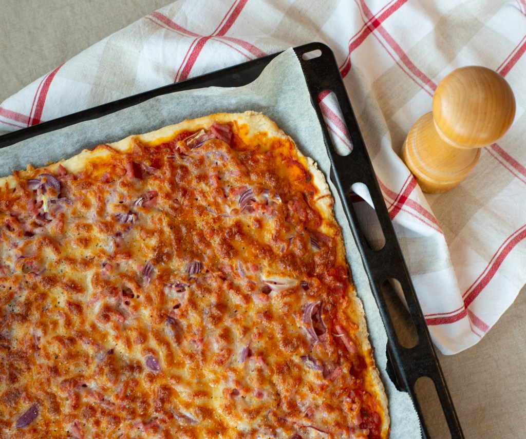 Kauli taikina pöydällä leivinpaperin päällä sopivan kokoiseksi pellille. Liu’uta paperin kanssa pitsapohja pellille ja laita Arrabiata-tomaattikastiketta sen verran, että pohja kuultaa hiukan läpi. Laita pepperoni-siivut seuraavaksi. Näin ne eivät irtoile pitsaa leikattaessa. Makukin pysyy hyvin tallella. Laita kinkkusuikaleet ja punasipulin lohkot. Lopuksi juustoraaste.