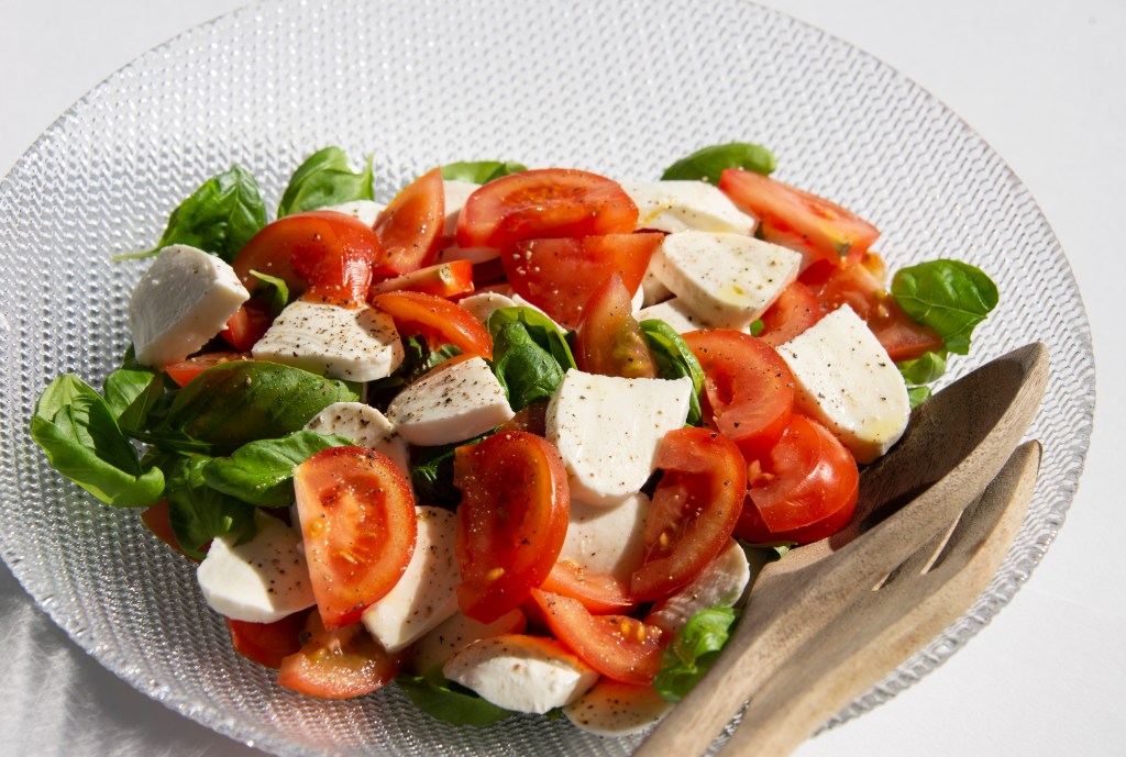 Laita laakeaan salaattiastiaan basilikan lehdistä puolet. Päälle puolet tomaattilohkoista ja puolet Mozzarellasta. Tee toinen kerros aloittaen basilikasta.