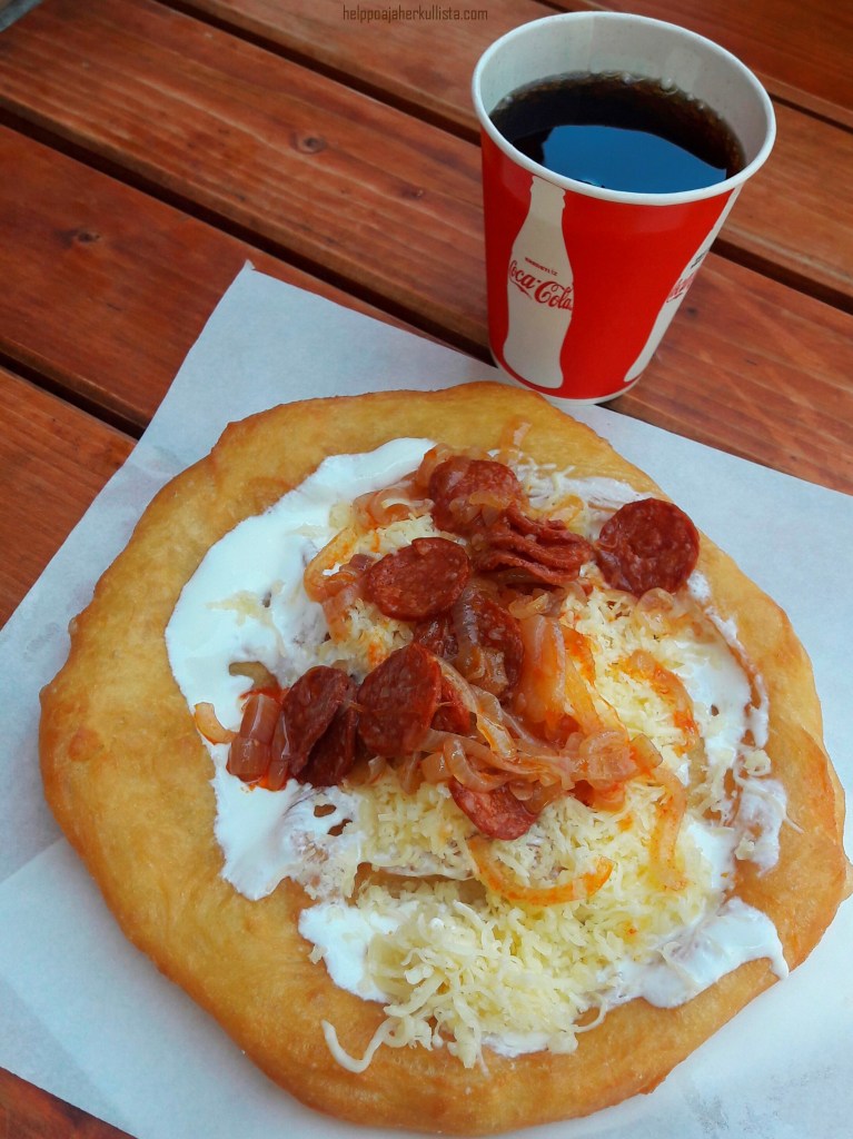 Kylpylän lähellä puistossa ( Kaupunginpuisto ) myytiin Langosta. päällä mm. pepperonia, sipulia, kermaviiliä ja juustoa. Rasvaista… Mutta lomalla kai voi herkutella;) Langos on perinteinen rasvassa uppopaistettava herkku.