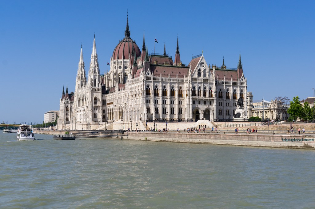 Kuvassa Unkarin parlamenttitalo joelta kuvattuna.