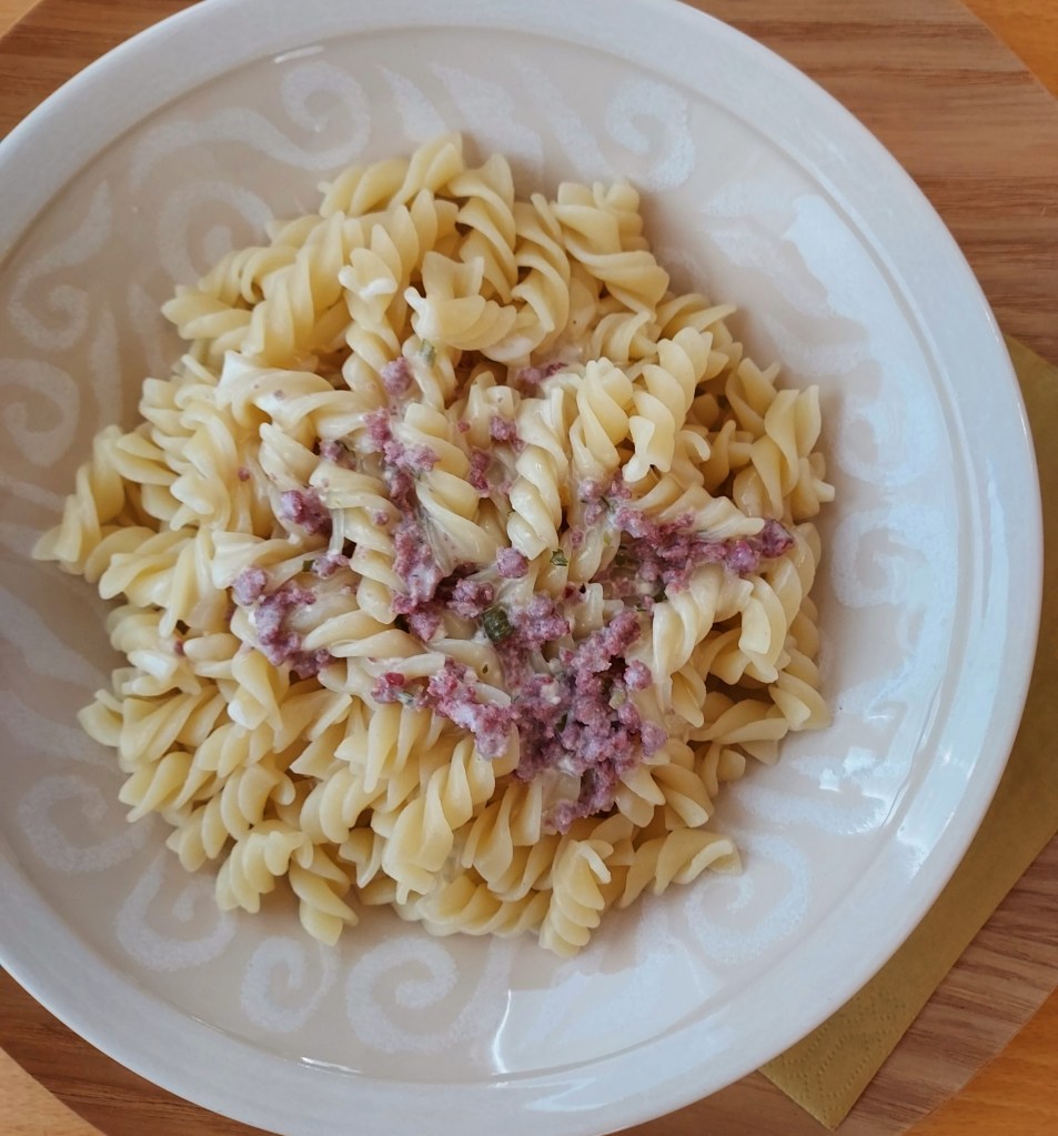 Meillä oli jäänyt pitsan teosta kylmäsavustettua pororouhetta vähän jääkaappiin. Kokeilin käyttää sen pastakastikkeeseen.