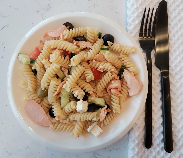 Palastele huuhdellut kurkku ja tomaatti, palastele oliiveja hieman. Laita pastan joukkoon.