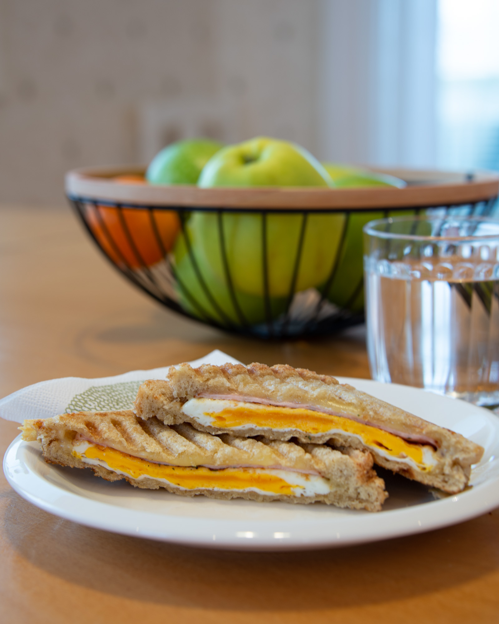 Toastin välissä kinkkua, juustoa ja paistettu kananmuna.