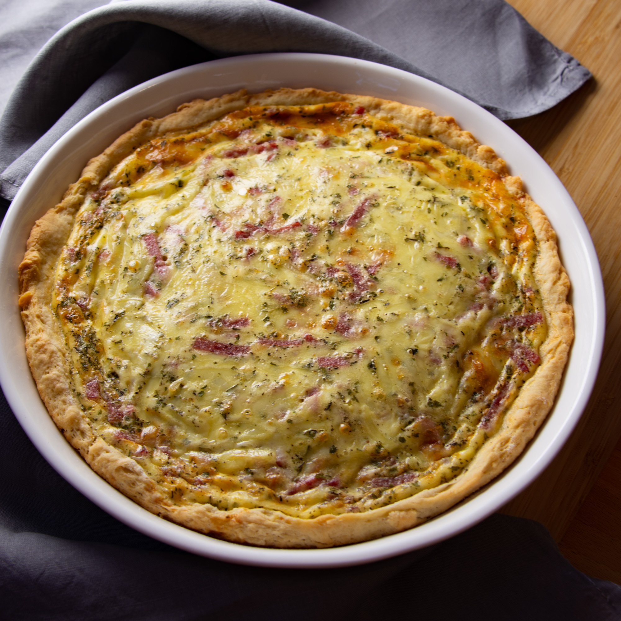 Lämpimänä tarjottava pehmeä kinkkupiirakka jossa runsaasti juustoa.